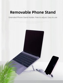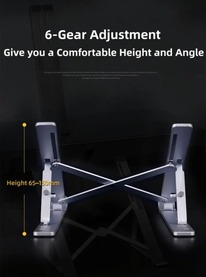 A foldable and portable aluminium laptop stand with phone holder, designed for comfort, cooling, and complete convenience—perfect for work, study, or travel. Product Features: 2-in-1 Design – Laptop stand with detachable phone holder for multitasking convenience 6-Angle Adjustable – Customize height and angle to reduce back, neck & eye strain Premium Build – Made from durable aluminum alloy for stability and long-lasting use Hollow Cooling Design – Enhances airflow and prevents laptop overheating Anti-Slip Protection – Multiple silicone pads keep devices secure without scratches Foldable & Portable – Ultra-slim design, easy to carry and store Color Options – Available in Silver or Black Wide Compatibility – Fits 11"–17" laptops, notebooks, tablets & smartphones Lightweight. Box Contents: 1* Laptop stand 1* Smartphone holder